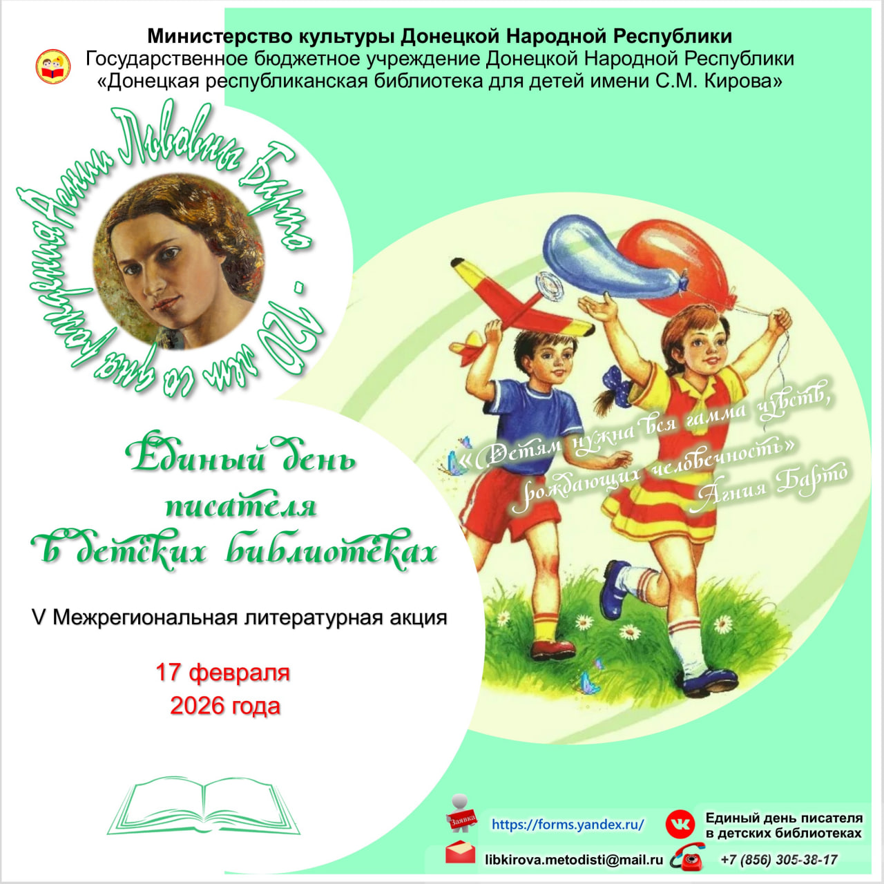 Донецкая республиканская библиотека для детей имени С.М. Кирова подвела итоги V Межрегиональной литературной акции «Единый день писателя в детских библиотеках». Мероприятие прошло при поддержке Министерства культуры Донецкой Народной Республики и было приурочено к 120-летию со дня рождения русской поэтессы Агнии Львовны Барто, которая является одним из самых издаваемых авторов детской литературы в России.