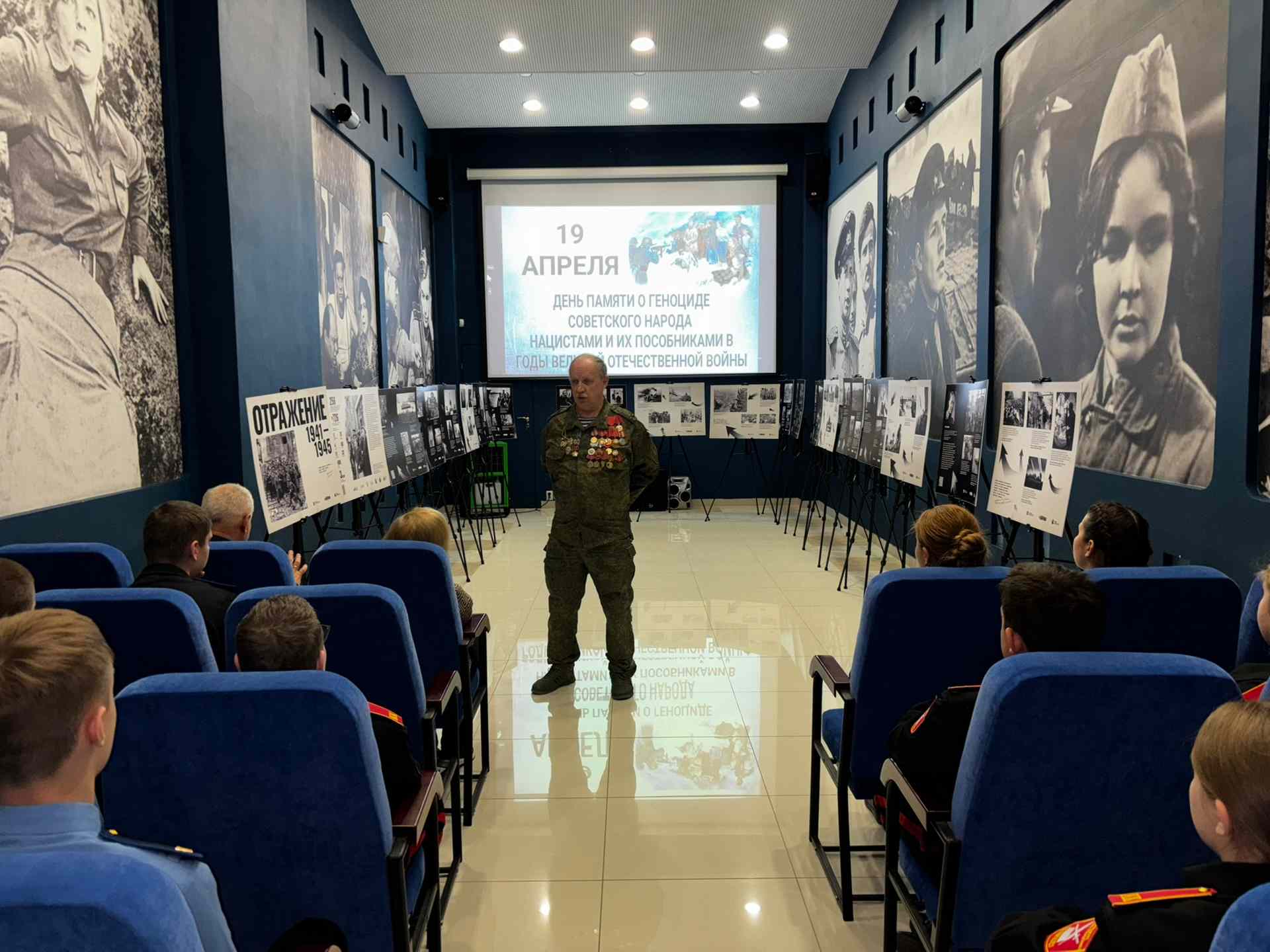 Центральным событием мероприятия стала презентация мультимедийной выставки «Трагедия и память», созданная на основе уникальных фондовых коллекций Донецкого республиканского краеведческого музея. Выставка представила участникам мероприятия, среди которых учащиеся Школs № 4 – кадетский корпус им. А.В. Захарченко, неопровержимые свидетельства преступлений нацистов на территории региона в годы Великой Отечественной войны. Информационные справки, фотографии, личные вещи и документы – каждый экспонат рассказывал свою историю, раскрывая масштабы трагедии. Период немецко-фашистской оккупации Донбасса (октябрь 1941 – сентябрь 1943 гг.) стал временем немыслимых зверств. Цифры говорят сами за себя: около 220 тысяч мирных жителей погибли от рук оккупантов, около 150 тысяч советских военнопленных были уничтожены, а порядка 252 тысяч человек были насильственно угнаны в Германию. Выставка «Трагедия и память» призвана не только рассказать об этих страшных страницах истории, но и сохранить память о тех, кто пострадал в годы оккупации Донбасса, увековечить их имена и судьбы.