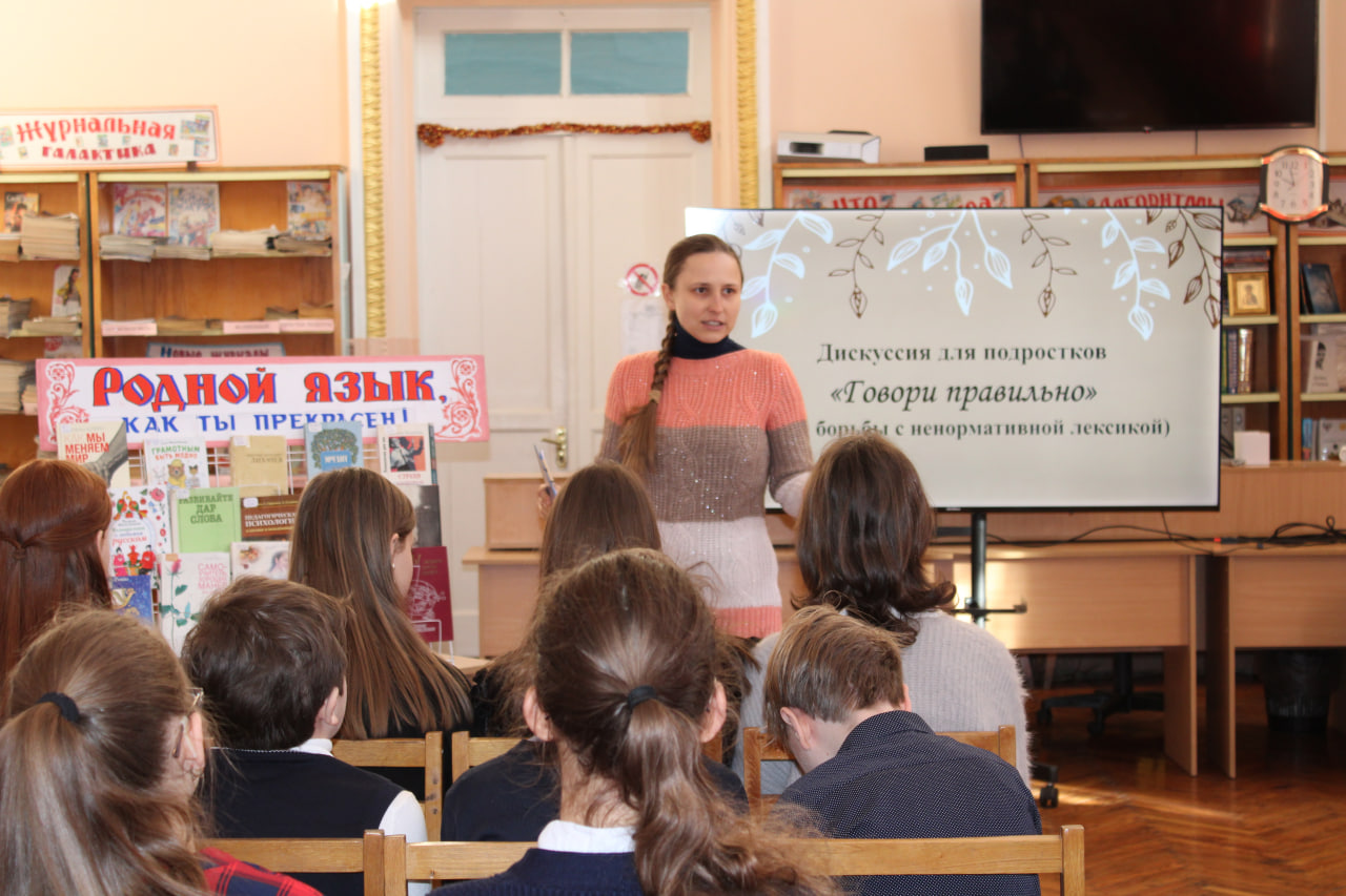 3 февраля, в День борьбы с ненормативной лексикой, библиотекари Донецкой республиканской библиотеки для детей имени С.М. Кирова провели дискуссию «Говори правильно» для обучающихся старших классов донецкой школы № 2 имени Героя Советского Союза Ю.М. Двужильного.