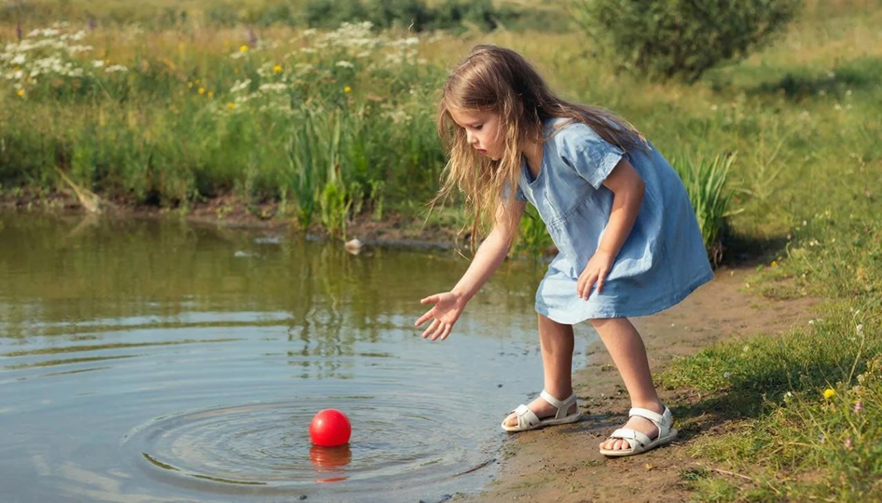 Уронила в речку мячик.