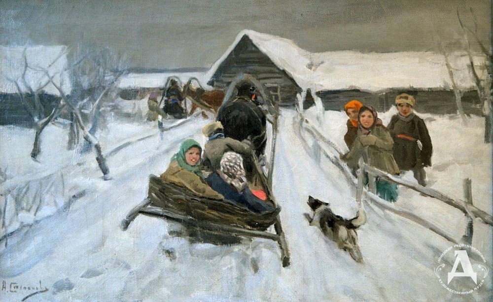 Вашему вниманию представляем работу Степанова Алексея Степановича (1858-1923) «У околицы», 1916 г., вариант картины «Катанье в деревне», 1911 г., холст, масло, 65х103 из собрания Донецкого республиканского художественного музея.