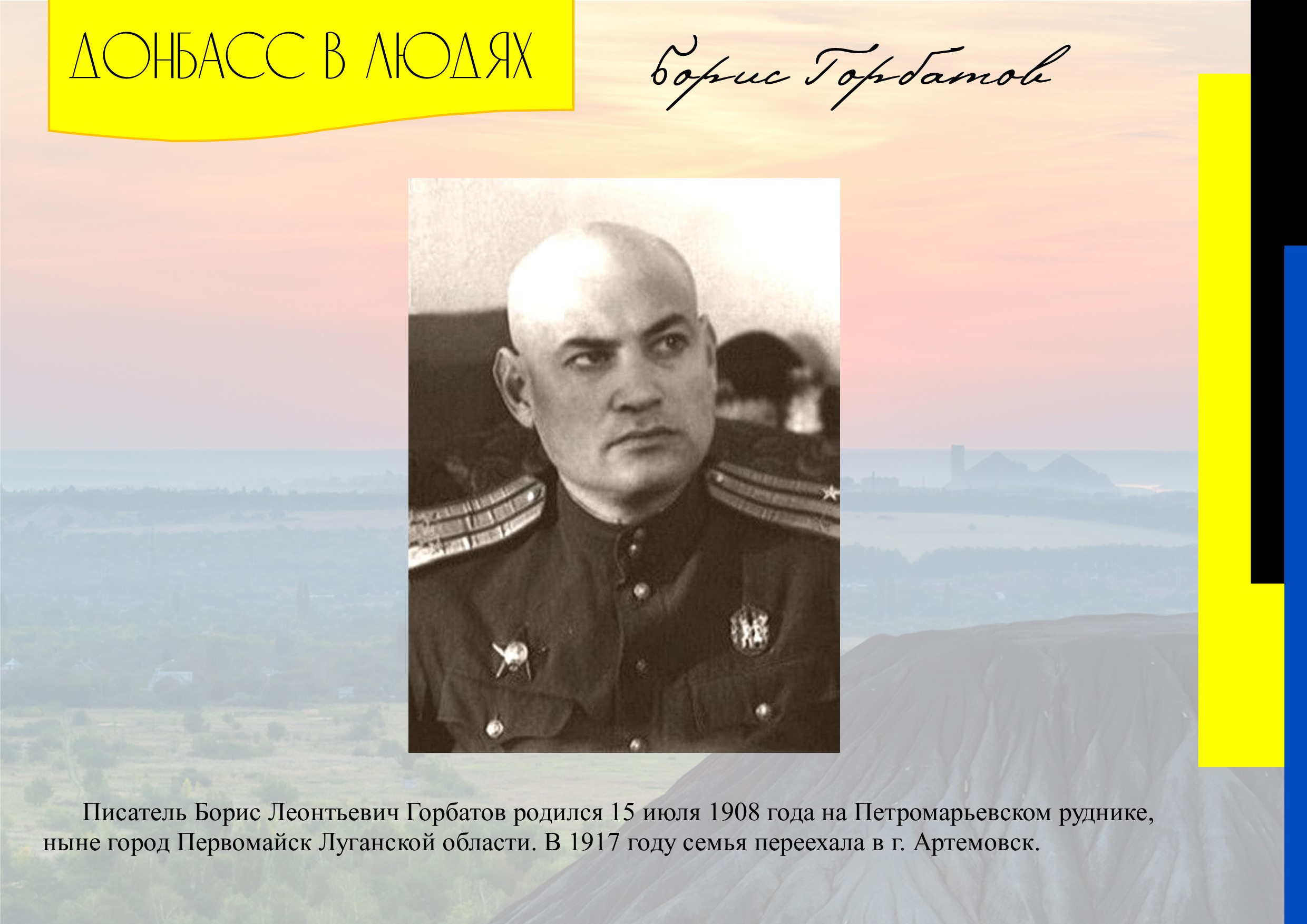 Третий выпуск краеведческой рубрики, посвящённой людям, прославившим наш край своими талантами и добрыми делами «Донбасс в людях» знакомит вас с автором романа «Донбасс» Борисом Горбатовым.