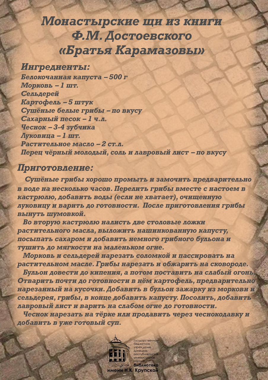 В рамках рубрики «Библиотекарь на кухне» предлагаем вам приготовить традиционное блюдо русской кухни – щи по-монастырски с грибами, идеально подходящие для постного меню.
