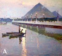 Мы видим, как на лодках рыбачат мальчишки в ожидании вечернего улова, неспешно прогуливающихся людей, красивый мост, щедро освещённый фонарями.