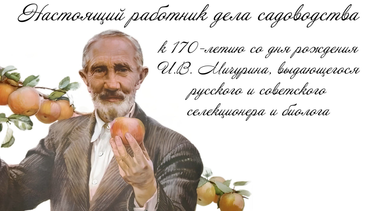 Представляем вашему вниманию видеолекторий «Настоящий работник дела садоводства», посвящённый жизни, судьбе и научному наследию Ивана Владимировича Мичурина – выдающегося русского и советского ученого-биолога, селекционера плодовых культур, новатора и экспериментатора в сфере сельского хозяйства, 170-летие со дня рождения которого мы отмечаем в этом году.