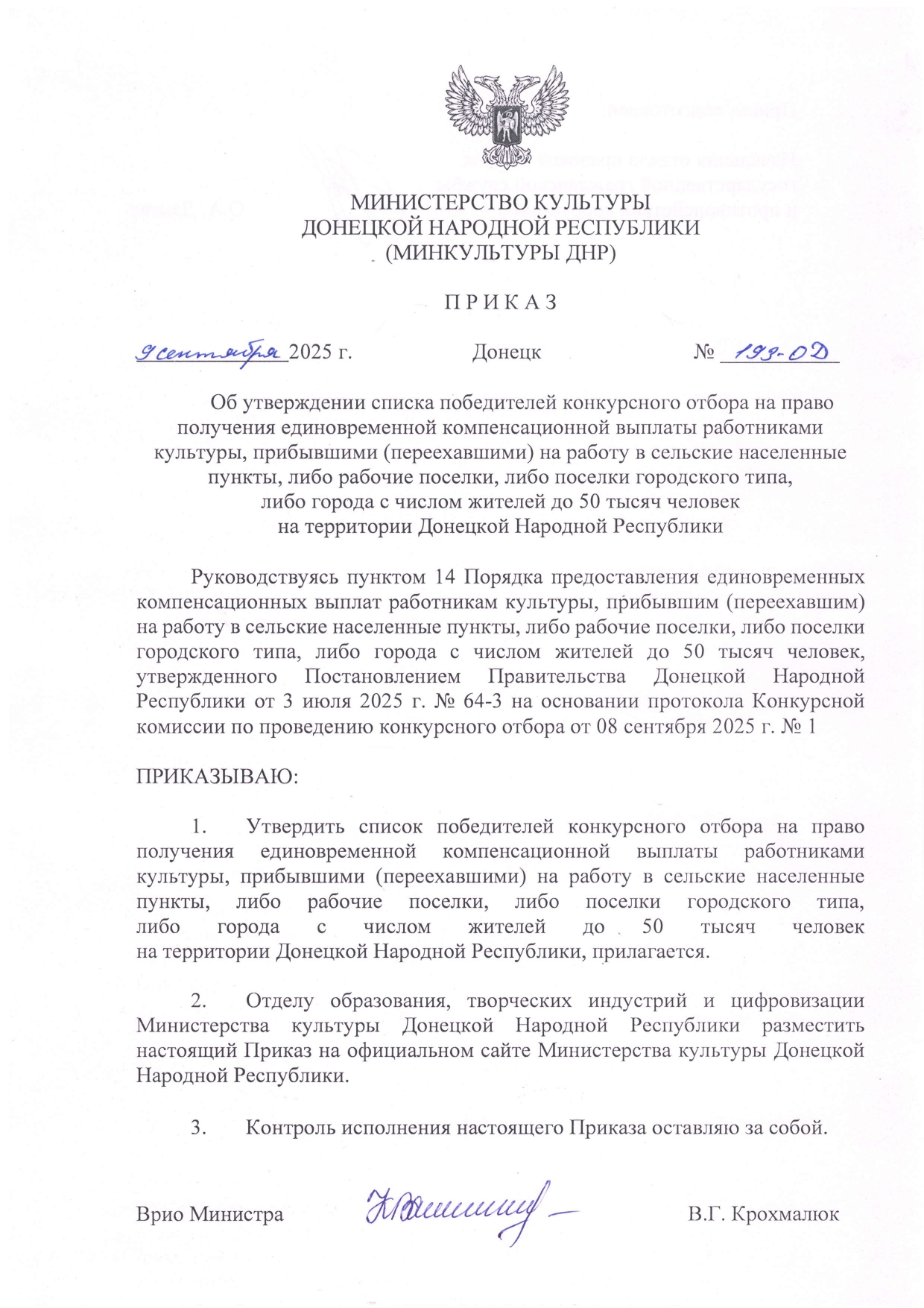 Приказ от 09.09.2025 г. № 193-ОД "Об утверждении списка победителей конкурсного отбора на право получения единовременной компенсационной выплаты работниками культуры, прибывшими (переехавшими) на работу в сельские населенные пункты, либо рабочие поселки, либо поселки городского типа, либо города с числом жителей до 50 тысяч человек на территории ,Щонецкой Народной Республики"