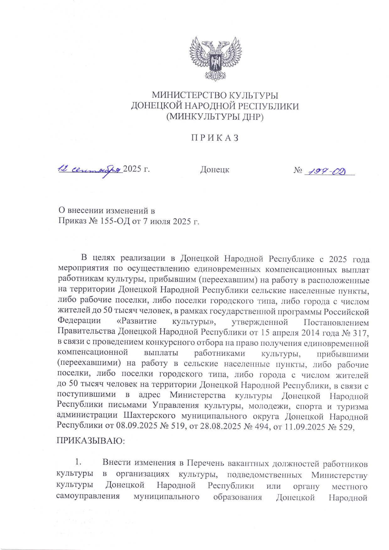 Приказ от 15.09.2025 г. № 199-ОД «О проведении дополнительного конкурсного отбора на право получения единовременной компенсационной вылпаты работниками культуры, прибывшими (перехавшими) на работу в сельские населенные пункты, либо рабочие поселки, либо поселки городского типа, либо города с числом жителей до 50 тысяч человек на территории Донецкой Народной Республики».